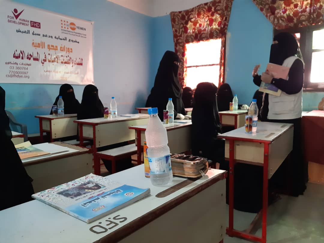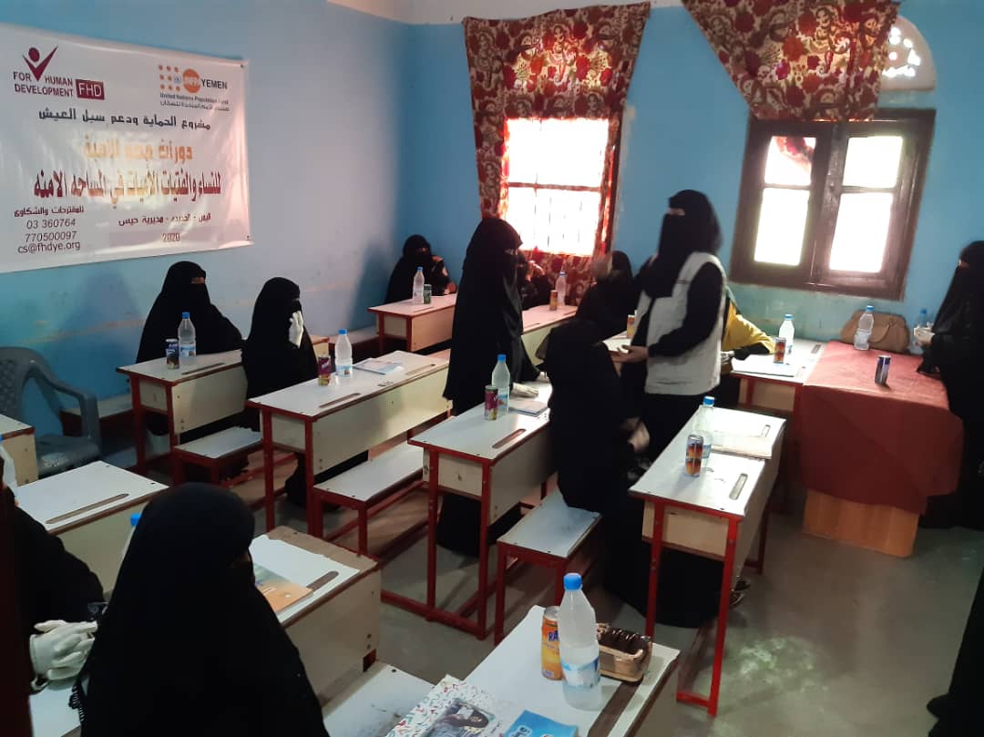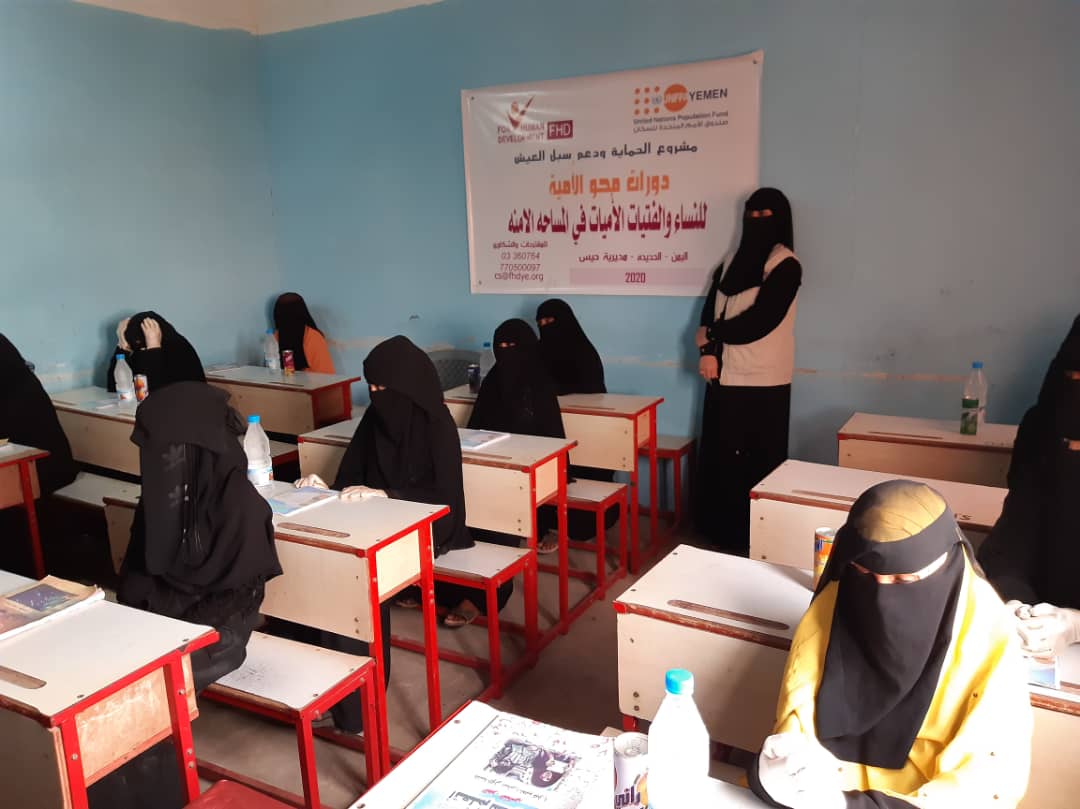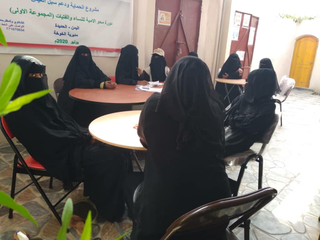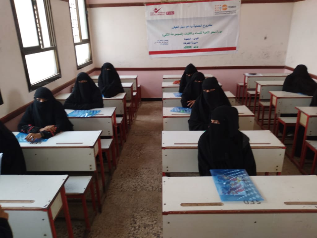 دشنت مؤسسة فورهيومن للتنمية دورة محو الأمية لغير المتعلمات من النساء والفتيات المستهدفات من مشروع الحماية وتوفير سبل العيش بمديريتي (الخوخة - حيس)