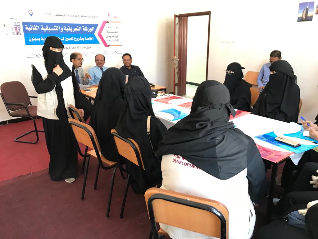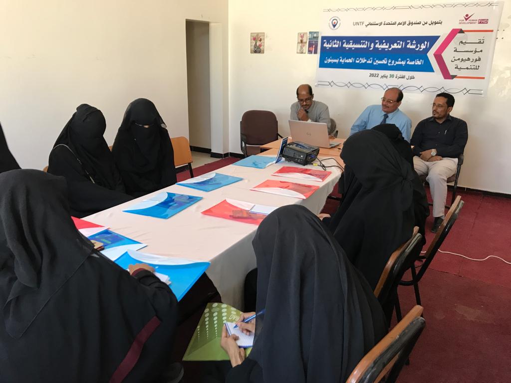 دشنت مؤسسة فورهيومن للتنمية الورشة التعريفية والتنسيقية الثانية الخاصة بمشروع تحسين تدخلات الحماية بسيئون بتمويل من UNTF وبحضور اعضاء من السلطة المحلية