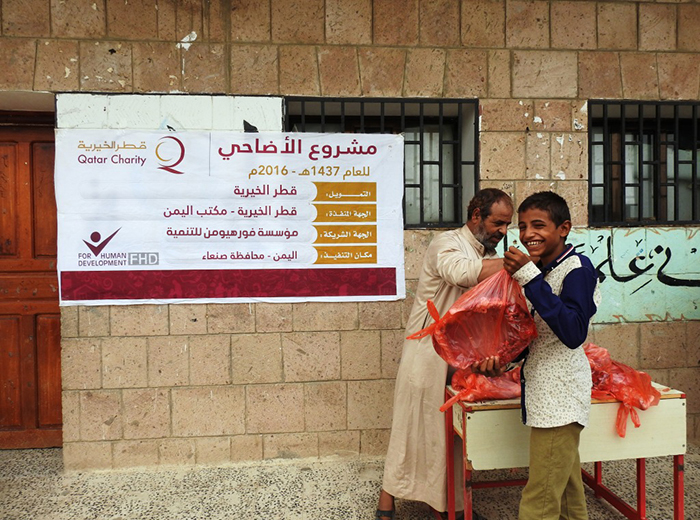 نفذت مؤسسة فورهيومن للتنمية وبدعم من قطر الخيرية مشروع الأضاحي في عيد الأضحى المبارك سعيا منها لإشراك الأسر النازحة والفقيرة والمتضررة فرحة العيد حيث قدمت 300 أضحية من الخراف ل 1200 مستفيد بأربع محافظات يمنية (صنعاء- تعز- الحديدة- حجة) بنصيب ربع خروف لكل أسرة وقد أحيا هذا المشروع سنة الأضحية وإطعام الفقراء وبث روح التكافل الاجتماعي بين أفراد المجتمع وأختتم بالدعاء من المستفيدين للداعمين وفاعلي الخير.