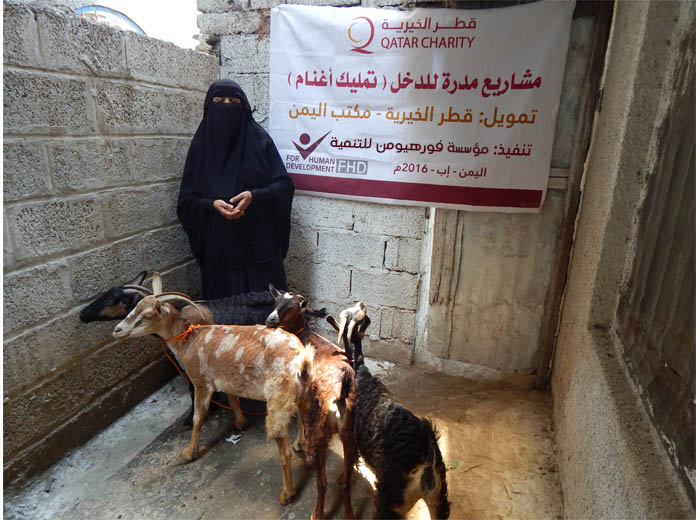 نفذت مؤسسة فور هيومن للتنمية بدعم كريم من قطر الخيرية 14 مشروع مدر للدخل وذلك في شهرسبتمبر للعام 2016 حيث تضمن المشروع أغنام للتربية وأبقار حلوب لصالح الأسر الفقيرة والنازحه المتواجده في محافظة إب بنصيب 4 أغنام أوبقرة حلوب لكل أسرة