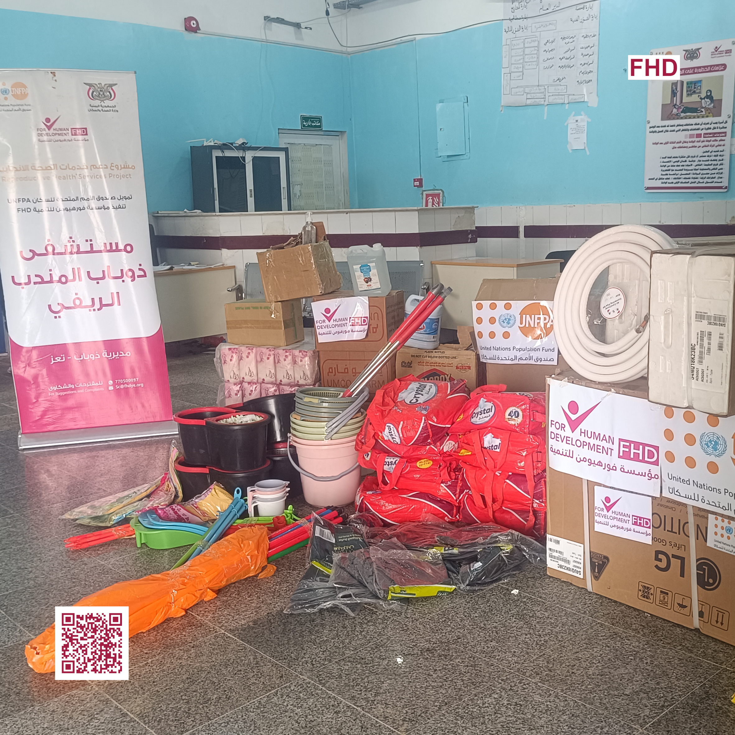 في إطار مشروع دعم خدمات الصحة الإنجابية، قامت مؤسسة فورهيومن للتنمية FHD، وبدعم من صندوق الأمم المتحدة للسكان UNFPA Yemen، بتوريد مخزونٍ حيوي من المحاليل الطبية الحيوية إلى كلٍّ من مستشفى ذوباب المندب الريفي ومركز جسر الهاملي الصحي في محافظة تعز.