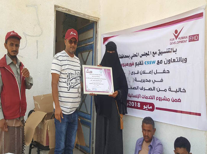 اقامت مؤسسة فورهيومن للتنمية يوم الاحد13/مايو احتفالين في كلا من مديريتي الملاح والمسيمير لاعلان القرى الخالية من ظاهرة التبرز في العراء والصرف الصحي المكشوف وتكريم قاداتهم المجتمعيين.